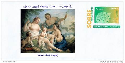 “Sobre prefranqueado” in Spagna In questi ultimi anni le Poste spagnole hanno emesso numerose buste prepagate su cui appare, in alto a destra, un francobollo della Zecca Nazionale, prestampato con immagine fissa: Sul lato destro la scritta SOBRE PREFRANQUEADO con a fianco una foglia con sopra un albero; in alto la scritta Correos. Tariffa A. Espana e, in basso, Envio Nacional Hasta 20 gr.. La metà a sinistra della busta è occupata da una illustrazione o da un logo o una immagine Re, Papa, monumenti o quadri di nudo ecc., scelti e approvati dall’Amministrazione Postale. Ad esempio: I l sistema del Prefranqueado iniziò ufficialmente nel 1988 . Promotore fu l’artista pittore Antonio Mingote che creò una serie di 24 buste con illustrazioni dal Don Chisciotte. Negli anni successivi furono stampate buste di formato e tariffe diverse per la posta interna o con l’estero. Di tali emissioni non si trova traccia nei cataloghi da me consultati. Durante le ricerche su Internet mi sono, però, imbattuto in un lungo e dettagliato articolo “Pagina de enteros postales di Francisco Manuel QUEROL”, nel quale ripercorrendo gli anni dal 1988 ad oggi l’autore elenca oltre 370 emissioni e nessuna di queste può essere collocata nella ricerca sui nudi artistici.Ma, navigando su Internet, in particolar modo nel sito Francobolli>Tematica>Arte> Nudi [Delcampe] ho riscontrato la presenza di centinaia di Enteros Postales legati al tema della mia ricerca. Si tratta della riproduzione di quadri che comprendono opere di Raffaello, Rubens, Botticelli, Modigliani, Picasso e innumerevoli altri pittori che abbracciano il periodo dal 1400 fino ai moderni illustratori del genere pinup. Ho attribuito la mancanza di notizie su di essi al fatto che i cataloghi fanno riferimento ai soli valori dentellati, al francobollo tout court e non alle buste prestampate. Considerando, però, che tali emissioni, presentando un francobollo prestampato, con tanto di Stato emittente, valore facciale e peso della lettera, a buon diritto dovevano pur far parte del tema della ricerca. Di tali buste prestampate ho, pertanto, citato l’autore, la sua biografia e riprodotto, a mo’ di esempio, uno o due valoril...lasciando ai collezionisti del genere il piacere di ritrovarne altri, consultando il sito www.delcampe.net alla voce Francobolli>tematica>arte>nudi. Volendo azzardare una ipotesi, queste emissioni potrebbero essere considerate alla stregua delle “emissions abusives” (vedi al paragrafo precedente) e , per le loro immagini osé, far parte dei francobolli “nigro notanda lapillo”... in polemica con André Gide, che li definì "nudi igienici”.