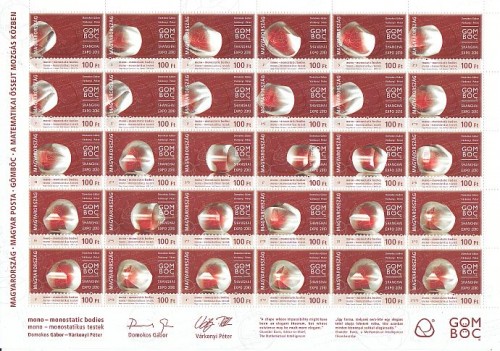 I francobolli sono stati emessi in fogli speciali, ciascuno composto da 30 francobolli differenti, che illustrano le diverse fasi del movimento del Gömböc. Basandosi sull'idea della signora Maria Csegezi, direttore dell'ufficio filatelico delle Poste Ungheresi, è stato emesso anche un libretto di francobolli, in cui le 30 fasi possono essere visualizzate in un movimento simulato, sfogliando rapidamente le pagine