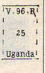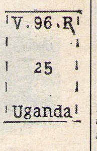 Anno 1895 (1/12)  e  Anno 1896 (13/22) valore facciale espresso in cowries (conchiglie).  Cowry  è il nome comune di un gruppo di piccole e grandi lumache di mare, gasteropodi molluschi. La parola cowry  è spesso usata per indicare solo i gusci di queste lumache, che nel complesso sono spesso a forma più o meno come un uovo, eccetto che sono piuttosto piatte nella parte inferiore. Le cowry venivano usate in gioielleria ma anche come monete. Le lettere che contraddistinguono i valori significano  U G  UGANDA GOVERNMENT; V R  REGINA VITTORIA