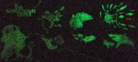 Anno 1995 ( 27 dicembre.) Treno. Nel valore c’è la scritta anti-contraffazione “Ucraina” visibile ai  raggi UV;  Anno 1996 (21 luglio) Trine e merletti. Lettere di sicurezza appaiono ai raggi UV;  Anno 1997 (5 set.) Fiamma.  Fuoco magico. Esposto ai raggi UV, il fuoco si trasforma nel fiore magico ‘tsvit paporoti’; Anno 2007 (838/9)  Angeli; Anno  2007 (BF56)  Spazio. Lancio dello Sputnik; Anno 2008 (883/894)  Fauna Cani. Gatti . Sotto la luce AV si vedono orme di cani e gatti; Anno 2008 (860/3) Giochi olimpici. Pechino;  Ann2008 (866/8)  Quadri di Chevtcenko; Anno 2008 (873)  Uovo di Pasqua; Anno 2008 (874/82) Orologi antichi; Anno 2008 (905) Unione politico-militare ucraino-svedese XVII) e XVIII sec. ;