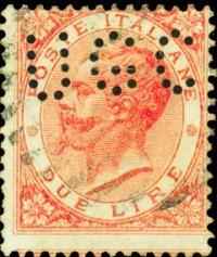Nel 1889, con il Regio Decreto 6152 viene ufficialmente permessa la perforazione dei francobolli (finora ammessa dall'amministrazione postale) con la seguente notizia: “Possono essere traforati, nel senso di riprodurre colla traforatura le iniziali dei nomi e cognomi dei mittenti, o determinate cifre, che non superino in grandezza il terzo della dimensione di essi francobolli.
