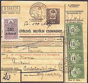 La notizia è accompagnata dalla fattura della  spedizione di un voluminoso pacco postale su cui furono apposti  un francobollo da 500 adopengo, 16 francobolli da 200 adopengo e un  francobollo da 10 per un totale di 74 quadriglioni di pengo  (74 seguito da ventisei zeri !!!)